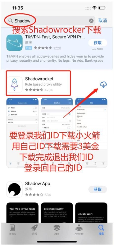 登录成功后,搜索下载Shadowrocket用我们ID下载小火箭,用自己的下载要3美金